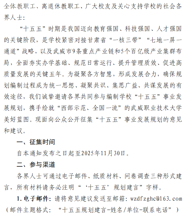 武威職業(yè)技術(shù)大學(xué)關(guān)于公開(kāi)征集“十五五”規(guī)劃編制意見(jiàn)建議的通知