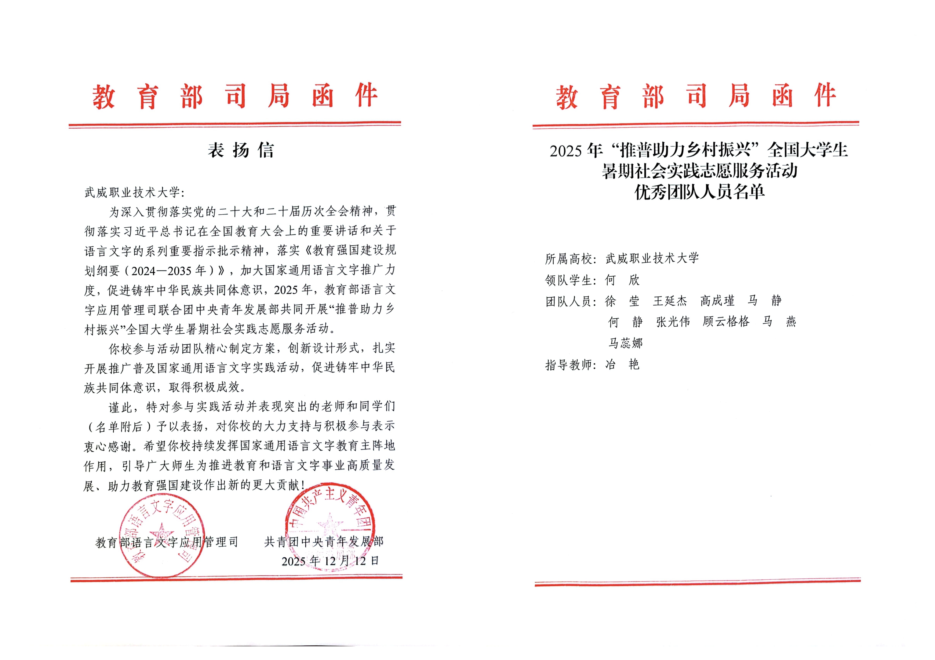喜報(bào)!武威職業(yè)技術(shù)大學(xué)“推普助力·鄉(xiāng)村振興”暑期社會實(shí)踐團(tuán)隊(duì)獲評全國優(yōu)秀團(tuán)隊(duì)