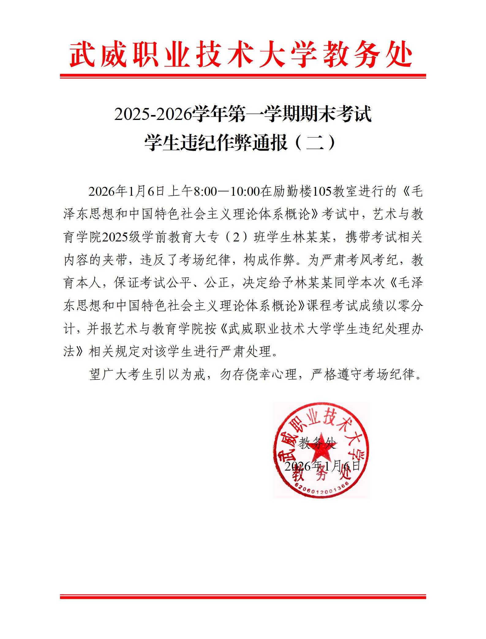 2025-2026學年第一學期期末考試學生違紀作弊通報(二)