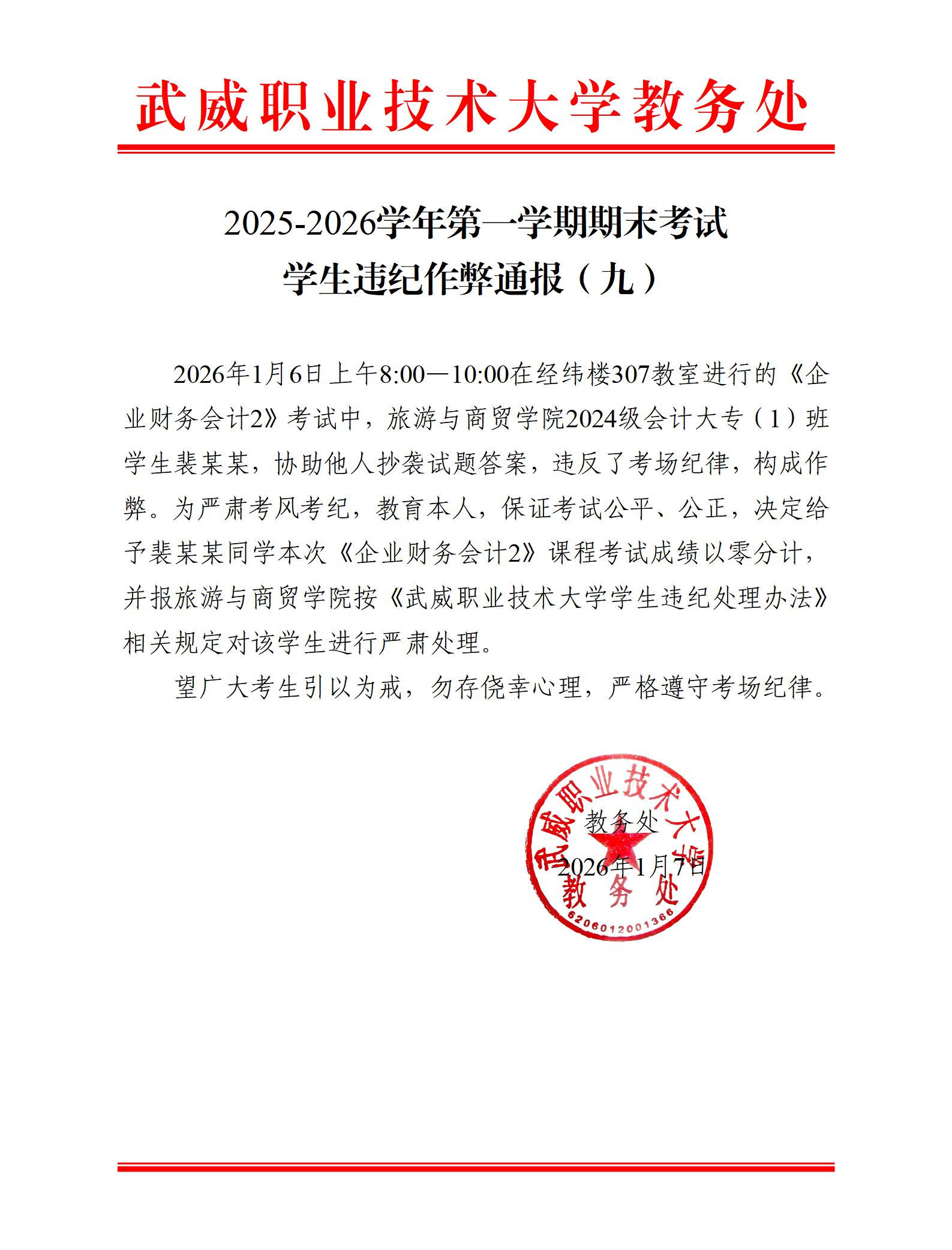 2025-2026學年第一學期期末考試學生違紀作弊通報(九)