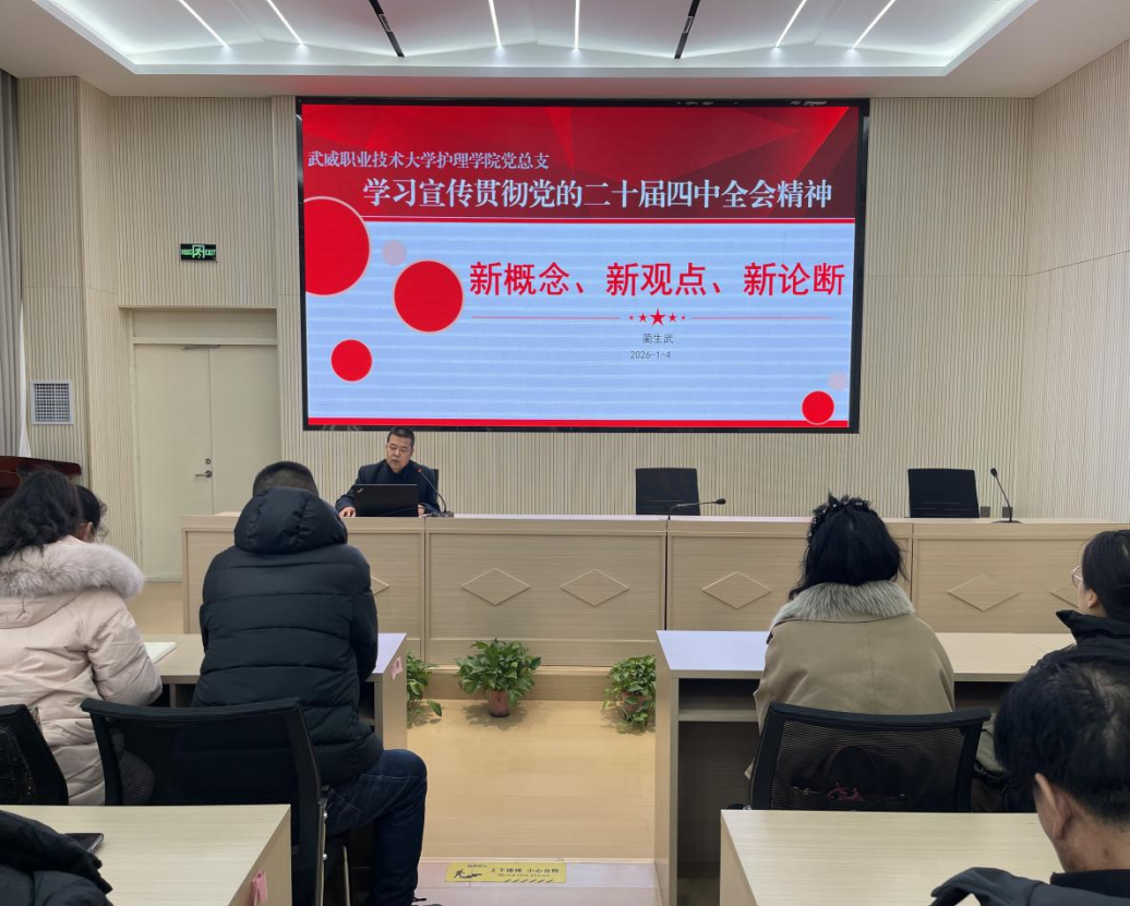 為深入學(xué)習(xí)貫徹黨的二十屆四中全會精神,準(zhǔn)確把握國家“十五五”時(shí)期發(fā)展藍(lán)圖與戰(zhàn)略部署,護(hù)理學(xué)院于1月4日下午在圖書館報(bào)告廳召開專題宣講會。學(xué)院黨總支書記藺生武作宣講報(bào)告,全體教職工、入黨積極分子及學(xué)生代表等80余人參加。